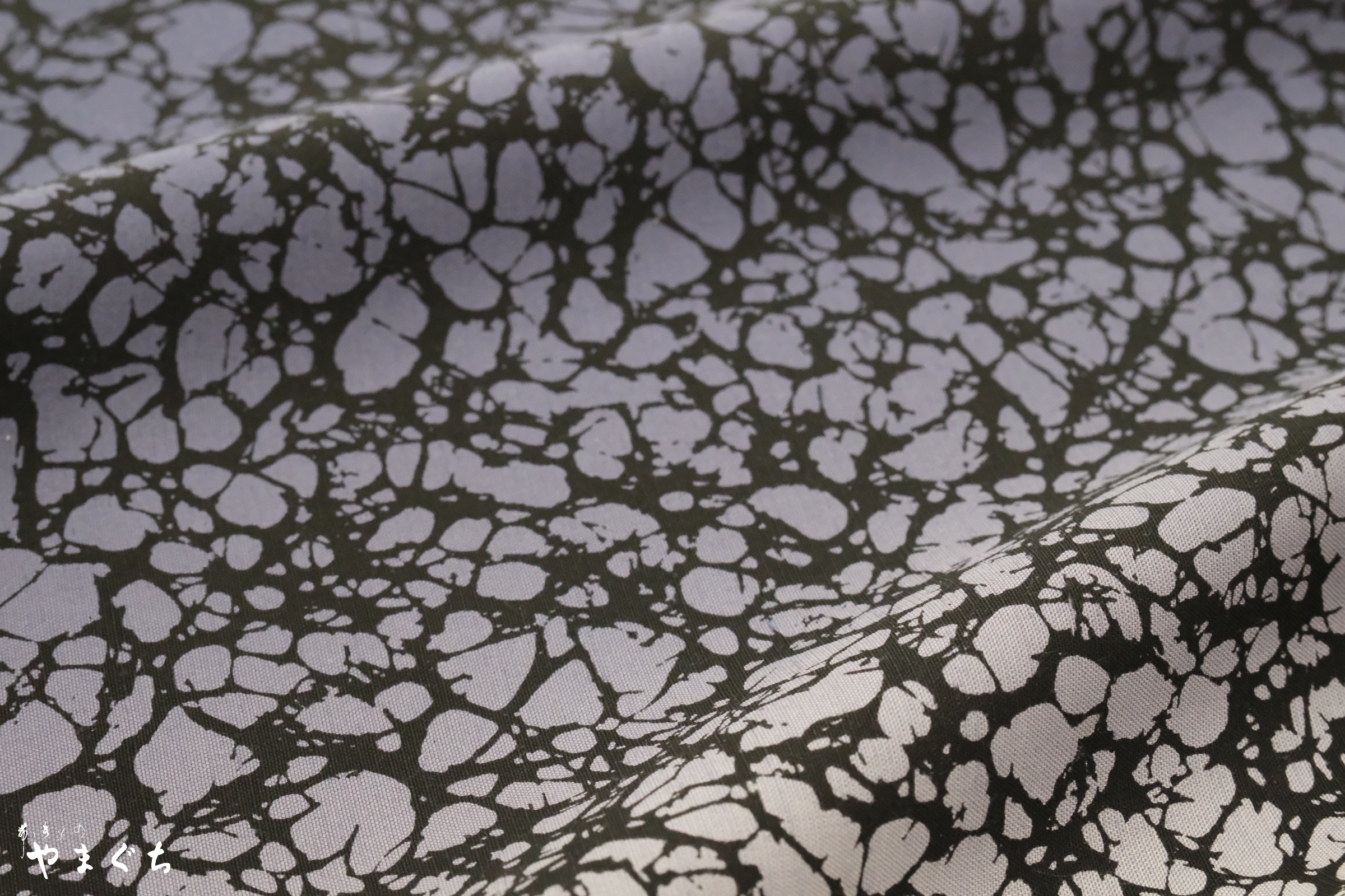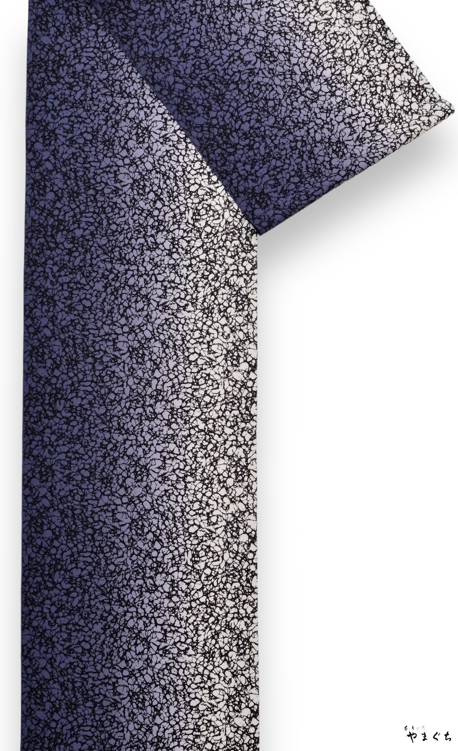くもの巣模様の型に黒糊置きし、手暈しで紫のグラデーションに仕上げられた男女問わずお召いただけるCOOLな着尺です。