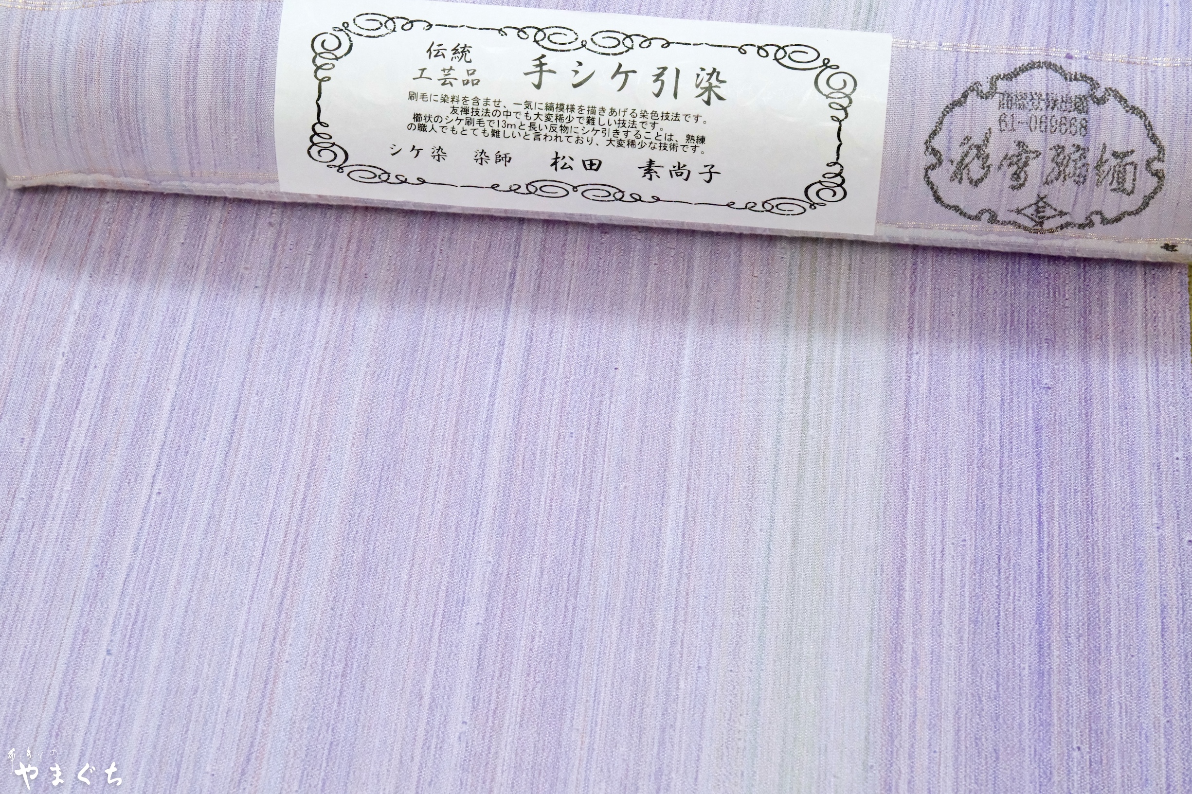 櫛状のシケ刷毛で13mと長い反物にシケ引きすることは、熟練の職人でもとても難しいと言われており、大変稀少な技術です。