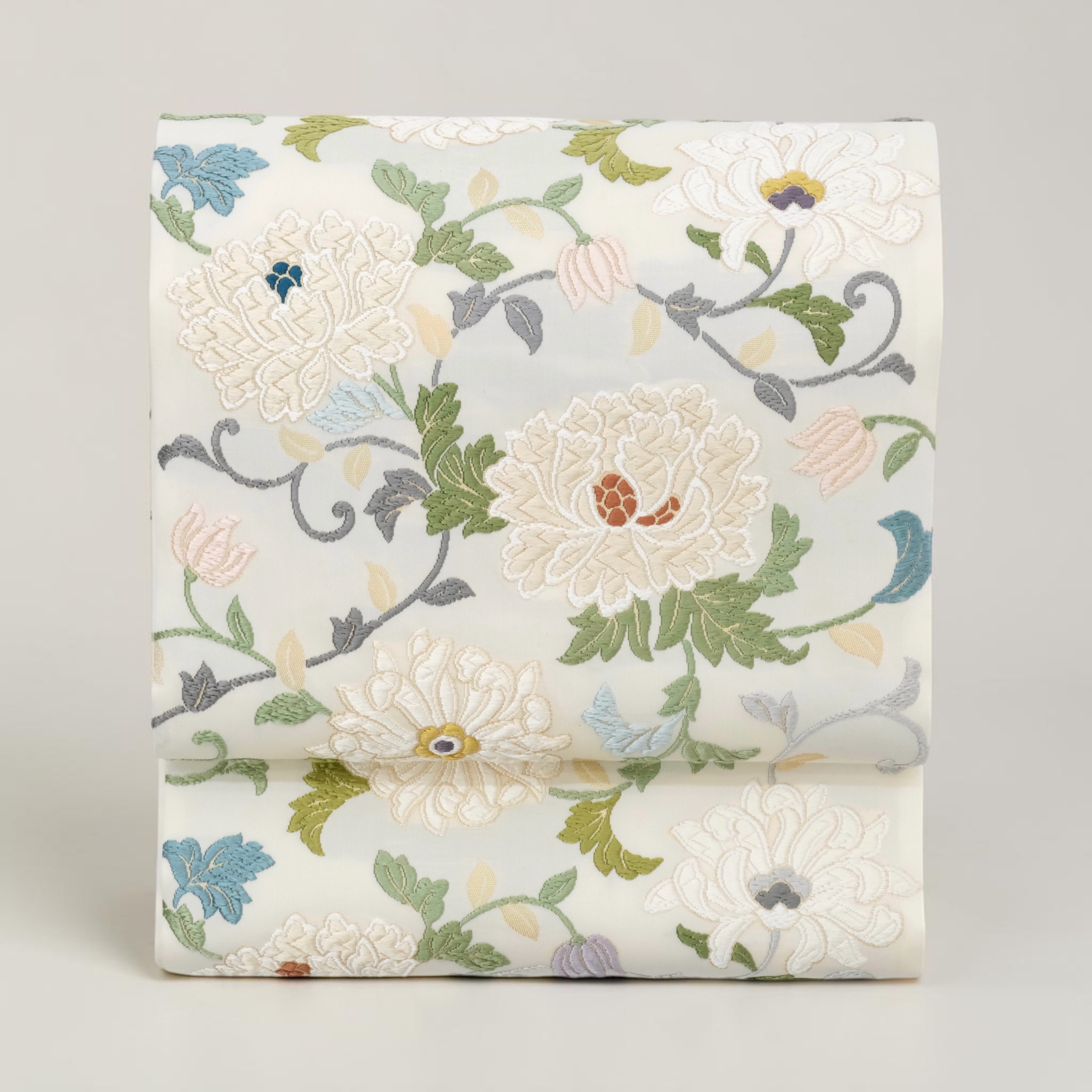 菊牡丹唐草文様を立体的な唐織で織り出した上品な袋帯です。